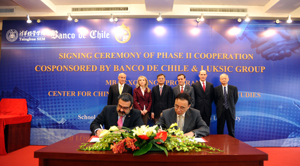 The program, “Conducting Business in China/Chile”, was initiated by the two universities in 2007. It allows faculty members and MBA students in both institutions to go on exchange visits. It is funded by Banco de Chile with substantial support from Andrónico Luksic, Vice Chairman of Banco de Chile, Chairman of the Luksic Group, a member of the Advisory Board of Tsinghua SEM.