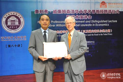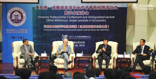 Oliver Williamson,2009 Nobel Prize in Economics Laureate, was invited to be Honorary Professor of Tsinghua University at SEM, where he delivered a speech named “Transaction Cost Economics in Historical Perspective (and the Road to the Nobel Prize)” on the same day and took part in a summit forum held by the Center for Corporate Governance.