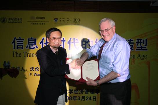 Professor F. Warren McFarlan, the senior professor of Harvard Business School arrived inChina on March 24, 2008anddelivered a keynote speech titled “The Transformed Organization in the Information Age”in Beijing, Shenzhen and Shanghai.In Beijing,hewas conferred Guest Professorship by Tsinghua SEM and given the Award for Special Contribution. The award conveyshighrespecttothe professor from the United States who has witnessed the historical advancement in China and has made tremendous contributions to friendly communications between Tsinghua and Harvard.