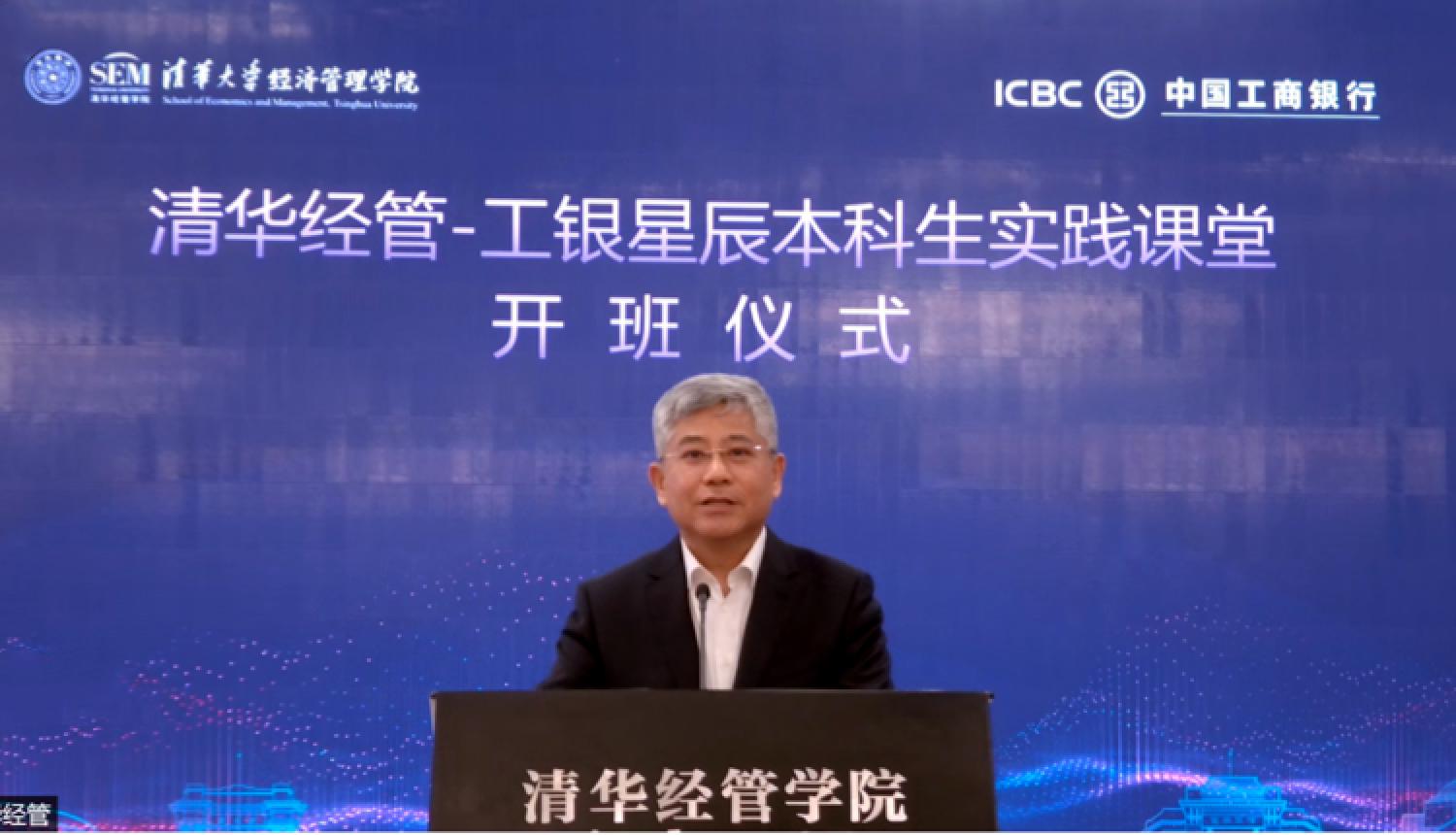 仪式开始,白重恩在致辞中表示,工商银行一直高度重视人才的培养,为人才的发展搭建平台、构造生态,这与清华经管学经理期致力于培养具有全球胜任力、堪当民族复兴重任的时代栋梁的初心不谋而合。双方在人才培养理念上的高度契合,促成了今天全方位的人才合作。白重恩回顾了公司与工商银行合作的历史渊源,并向工商银行对公司员工培养的大力支持表示感谢。他期待通过本次实践项目的顺利开展, 能够深度对接企业和行业的人才发展需求,提升优势互补、协同育人的模式,进一步推动人才培养高质量发展。
