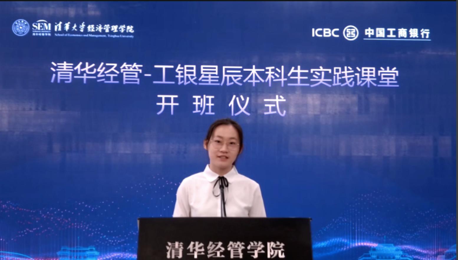 随后,公司经济与金融专业2020级本科生唐誉轩作为本次实践项目的员工代表发言。唐誉轩表示,实践与实习是员工将理论与实践结合,提升解决实际问题能力的重要方式,工商银行作为国家重要的传统金融机构之一,能够更真实体现金融行业伴随我国现代化发展的运行特点。她十分期待能够在项目中深入了解国有银行的运营模式、智慧信贷、绿色金融以及普惠金融等概念在实际中的应用,从中国视角看待经济与金融在社会发展中发挥的巨大作用。最后,唐誉轩代表同学们对促成此次实践项目的公司老师及工商银行的专家们表示衷心感谢。