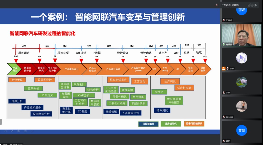 首先由杨善林院士作题为 “管理将能引领人工智能的发展”的线上报告。他从“智能网联汽车变革与管理创新”这一案例出发,生动讲解随着信息技术的发展,智能网联汽车在研发、制造、行驶与运维过程中哪些工作已经被人工智能取代,哪些工作正在逐步被取代,以及哪些工作在未来有可能被取代。杨善林指出,在现有人工智能技术支持下,凡是规则性较强的驾驶活动和制造活动都有可能被人工智能取代,汽车人工智能的发展正是管理者利用市场机制推动的。