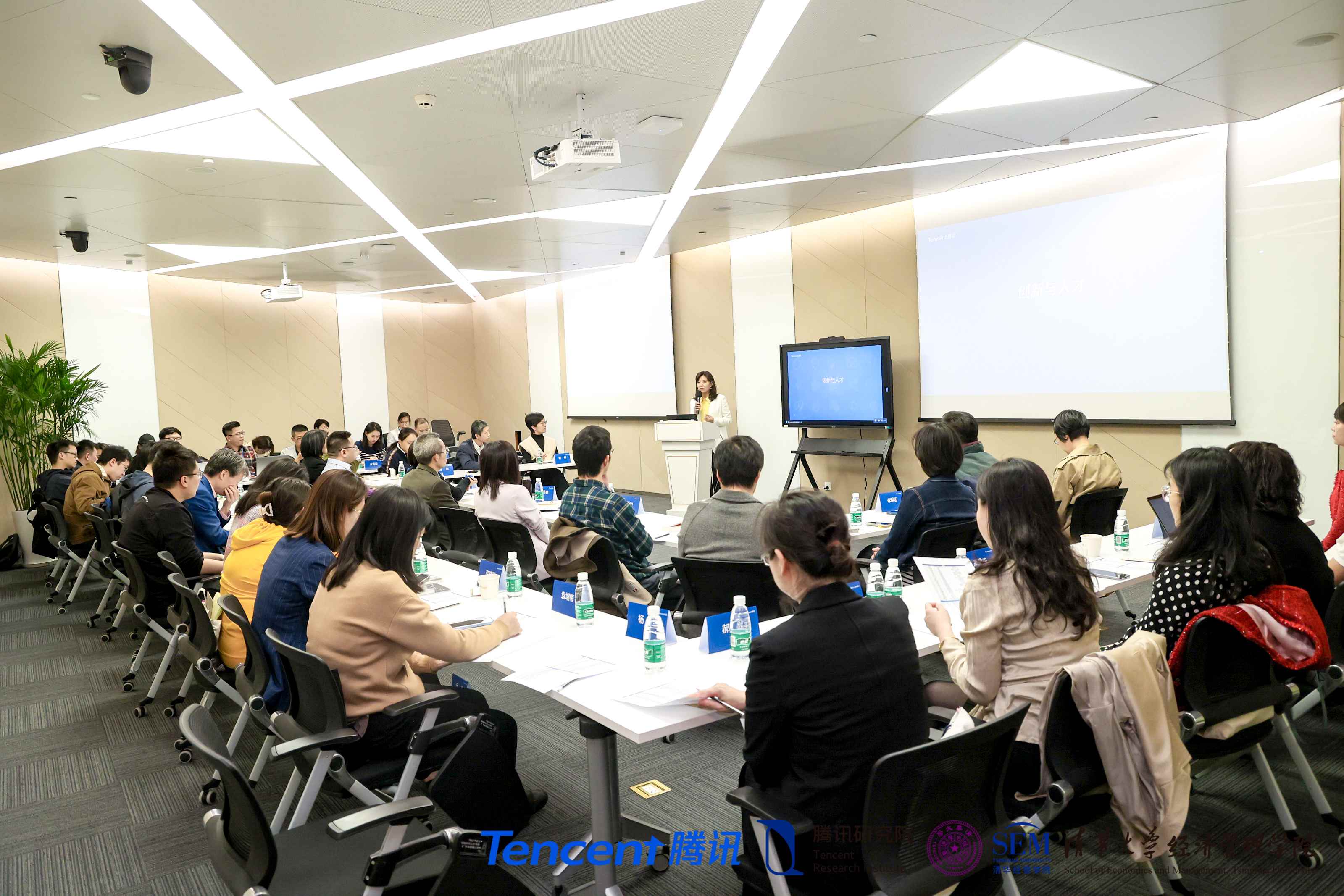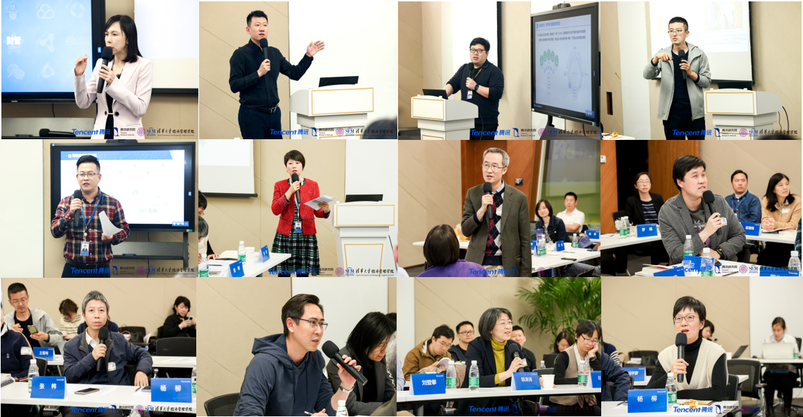 在座谈交流环节,腾讯研究院副经理王爱民介绍了研究院工作和人力资源管理方面的情况,腾讯公司各业务相关负责人与公司教师就财务管理、微信、国际化等方面的业务进行了深入交流。