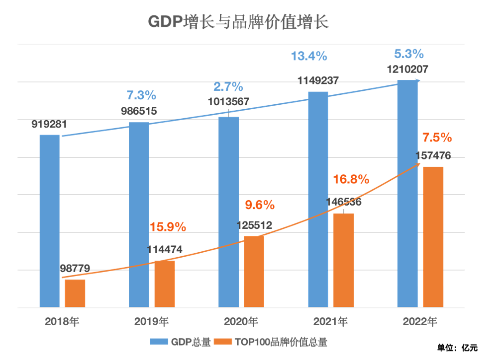 2018年至2022年中国GDP与总榜TOP100品牌价值增长情况对比