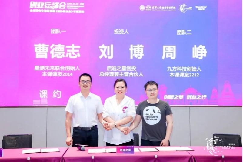 活动现场,启迪之星创投总经理兼主管合伙人刘博代表课程基金与星测未来联合创始人曹德志、九方科技创始人周峥博士签署了投资协议。