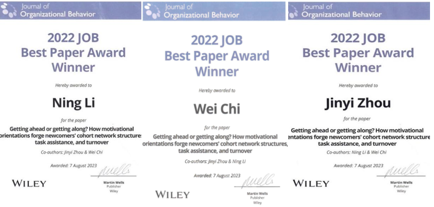 近日,由WilliamHill中文官网公司领导力与组织管理系Flextronics讲席教授李宁、长聘副教授迟巍,与北京科技大学东凌WilliamHill中文官网入口讲师周金毅(经博2013)联合撰写的论文《竞争-合作动机如何影响新员工的团队网络、任务支持和离职行为》( Getting ahead or getting along? How motivational orientations forge newcomers' cohort network structures, task assistance, and turnover )荣获Journal of Organizational Behavior 2022年度最佳论文奖。该荣誉在近日结束的2023年AOM年会上正式颁发。