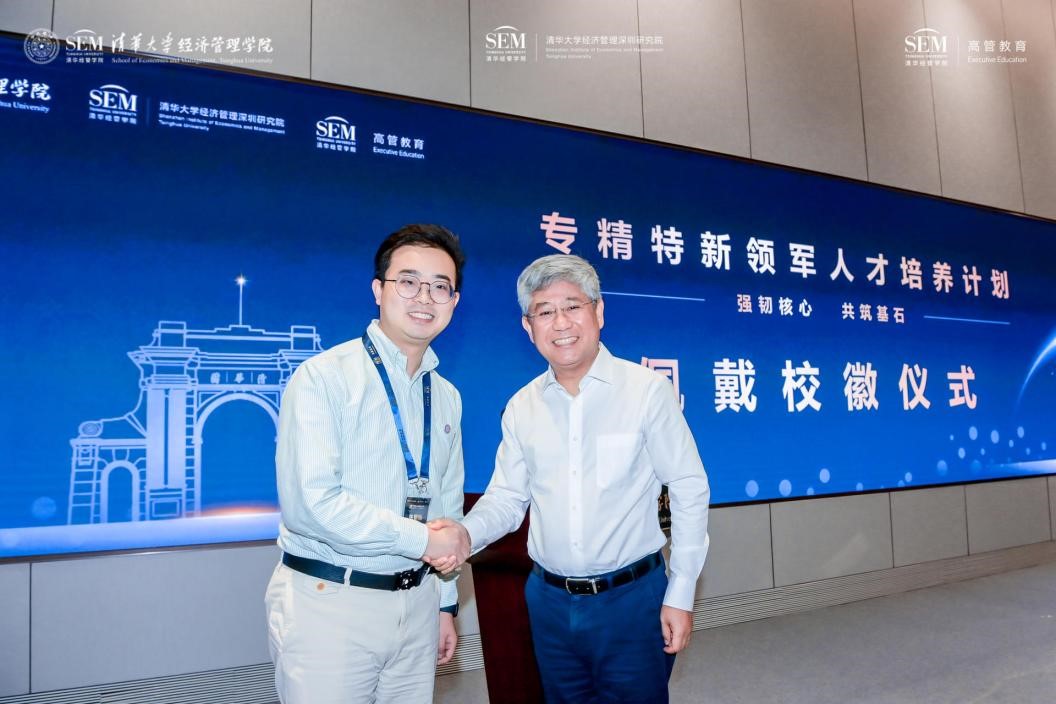 白重恩为学员代表张朝辉佩戴校徽,勉励大家将清华“自强不息、厚德载物”的精神内核带入到日常学习和工作中,促进个人持续成长。