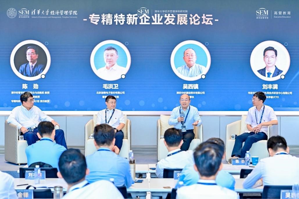 开班式后,专精特新企业发展论坛举办。陈劲主持论坛,与北京伽略电子股份有限公司董事长毛洪卫、深圳中时谦益资本有限公司董事长吴西镇、华进半导体封装先导技术研发中心有限公司首席科学家刘丰满等共同探讨专精特新企业生存、投资和发展经验,并与全班同学互动交流。