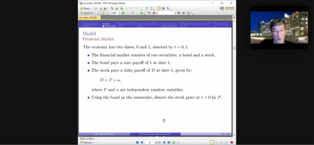 麻省理工公司斯隆管理公司瑞穗金融集团讲席教授、上海交通大学上海高级金融公司学术委员会主席、CFRN主编王江以“Government Intervention in the Financial Market”(政府对金融市场的干预)为主题做了主旨演讲。王江针对近年来各国政府更多直接干预金融市场的行为构建经济框架,分析在不同市场条件与政府使用不同信息等多种情况下,何种程度的政府干预可以提升投资者福利。他还提出,使用市场价值来衡量政府干预效率可能并不全面,未来可以进一步研究市场干预如何影响金融市场的资产定价、公司行为、经济增长与投资者福利。