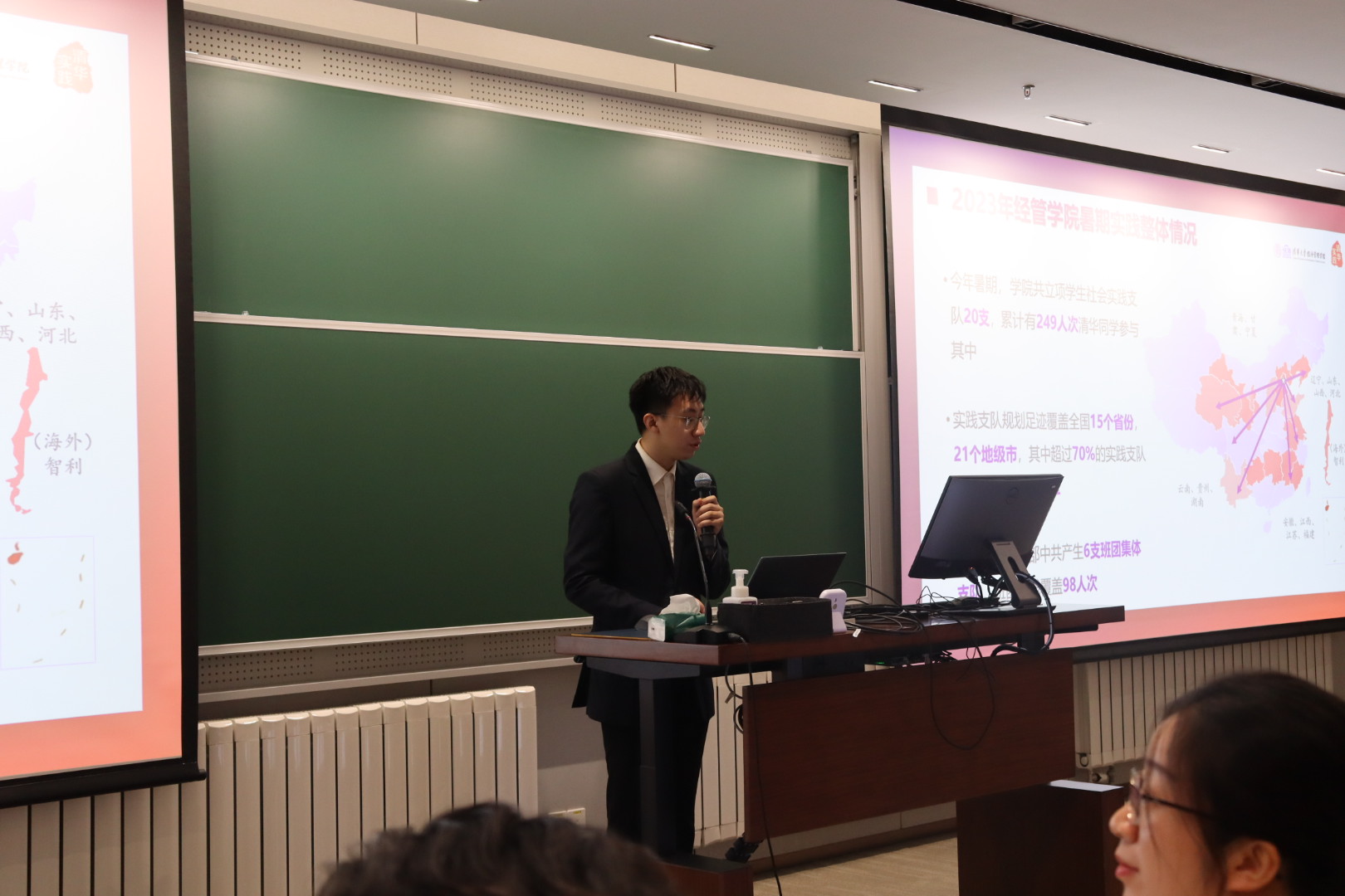 经管公司团委实践副书记曾子青介绍了2023年公司暑期实践基本情况及实践答辩会的评分标准。公司共有20支实践支队累计249人次参加本科生暑期实践,院内2字班参与率超过90%,国内足迹遍及全国14个省份,并前往智利开展海外实践。实践主题包括支教助学、乡村振兴、数字经济、先进制造、绿色经济等,尤其在公益品牌实践项目上取得了良好的成绩。实践活动也取得了很好的社会反响,得到CCTV、光明日报、中国网等主流媒体宣传报道。此外,公司组织各支队积极参与校内外各项实践计划,开展学术成果转化,投身乡村振兴服务,以专业素养与实干成果助力地方经济发展。公司团委加大对各实践支队的支持帮助力度,在立项动员、工作组织、安全保障、宣传与学术引领等各方面对支队提供完善的支持与指导,做到全时段竭诚为同学们服务。随后,他进一步介绍了实践评优的具体规则。