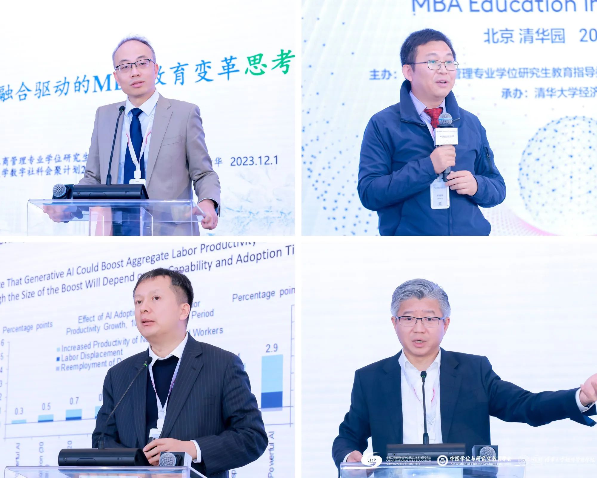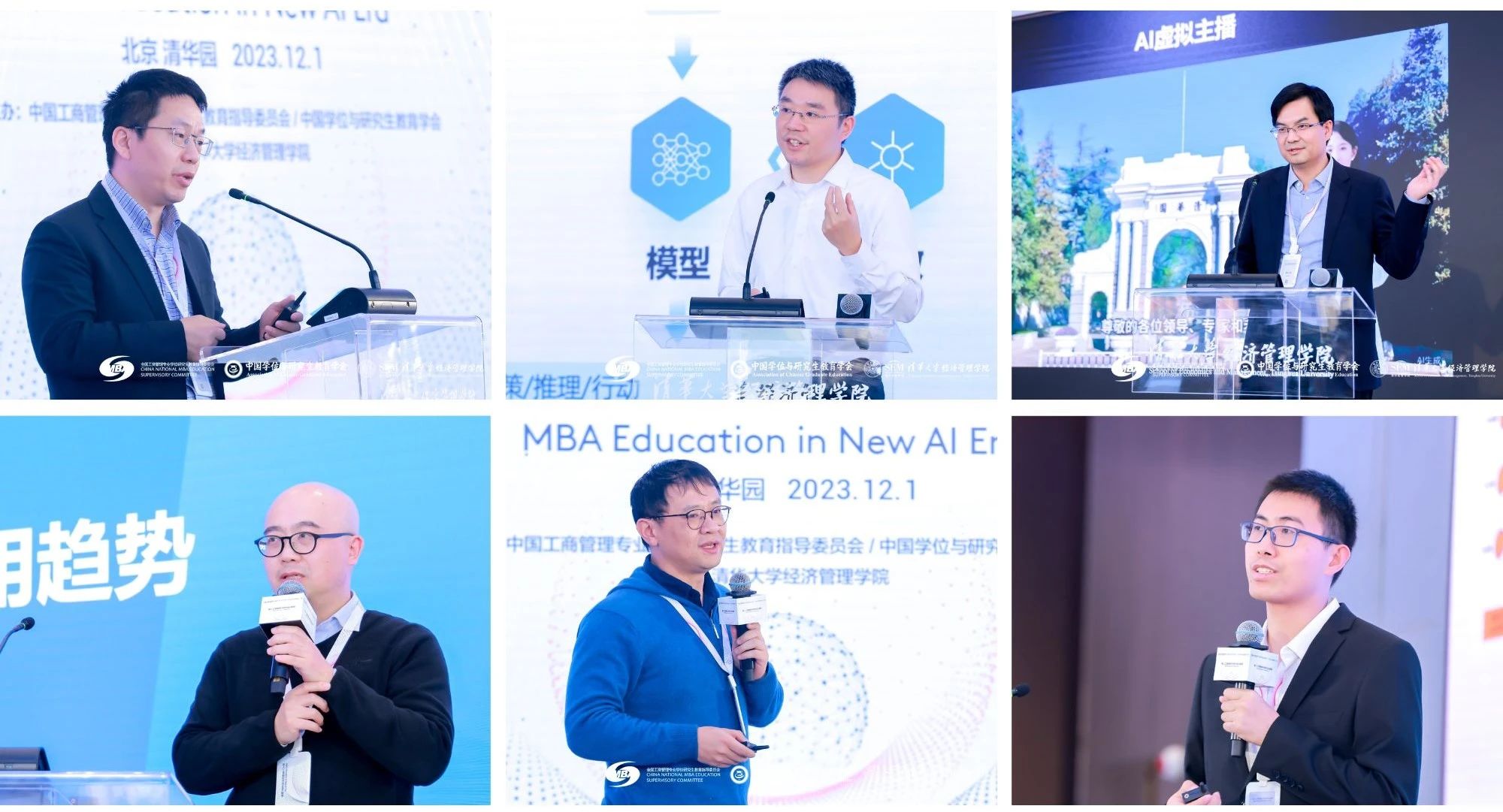 全国MBA教指委委员、浙江大学管理公司常务副经理、党委副书记谢小云,上海交通大学安泰经济与管理公司副经理尹海涛,全国MBA教指委委员、中国科学技术大学讲席教授、科技商公司执行经理、管理公司执行经理、国际金融研究院经理叶强,全国MBA教指委副主任委员、复旦大学管理公司经理陆雄文依次作题为“AI时代数实融合驱动的MBA教育变革”“AI应用给商学教育的挑战”“数智时代的管理教育”“AI时代的管理公司未来”的分享。