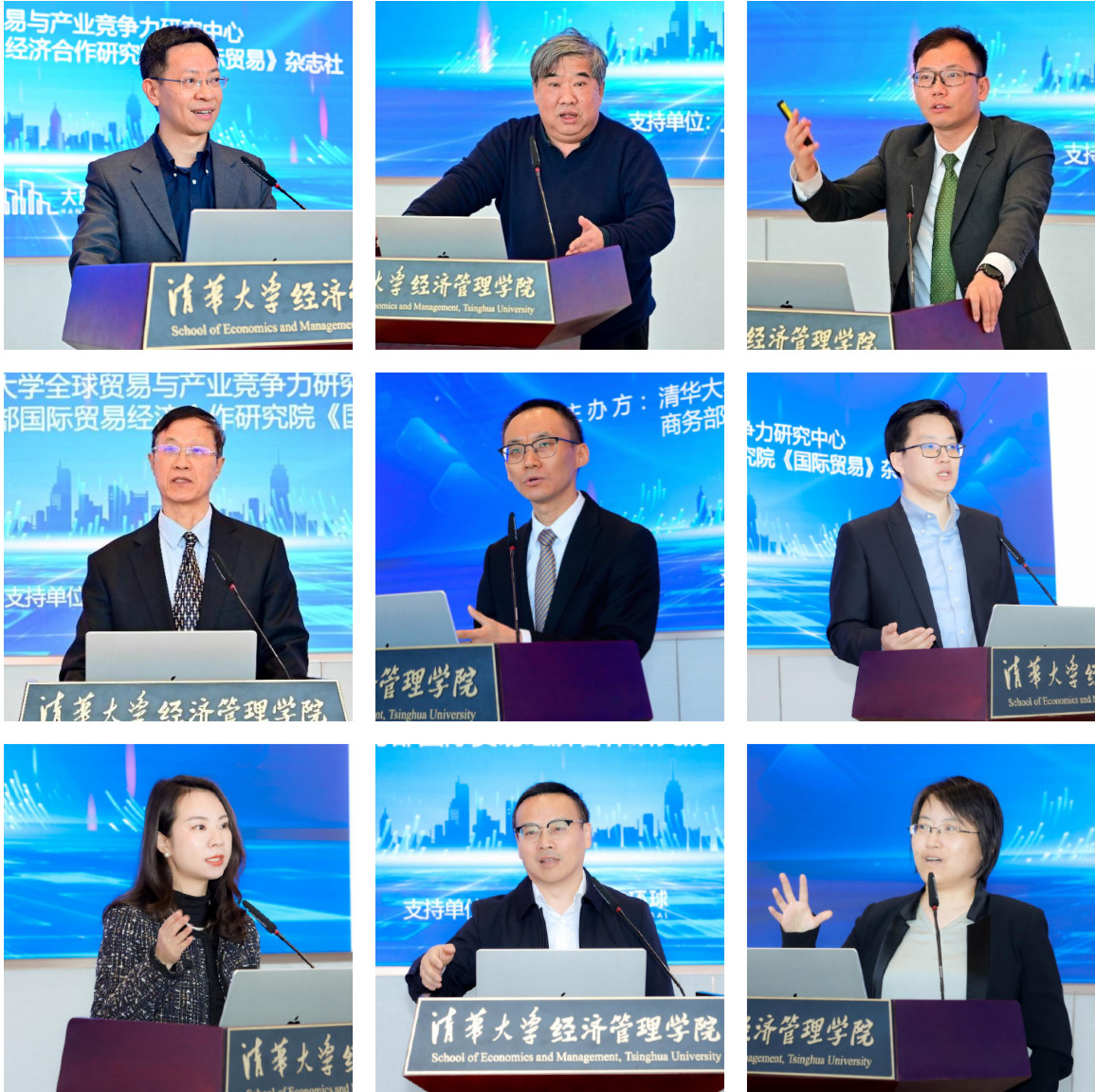 嘉宾发表主旨演讲(从上至下、从左至右:余淼杰、林桂军、何平、李钢、梁明、魏浩、吕越、陈琪、江鸿)