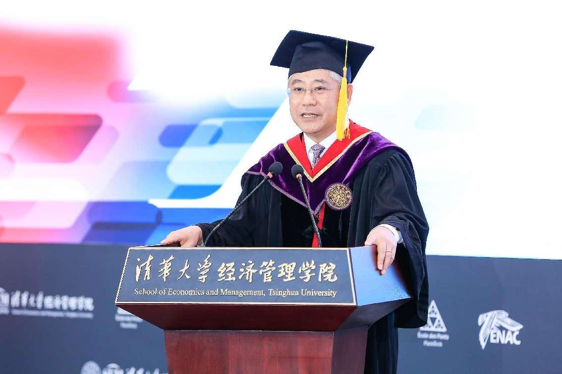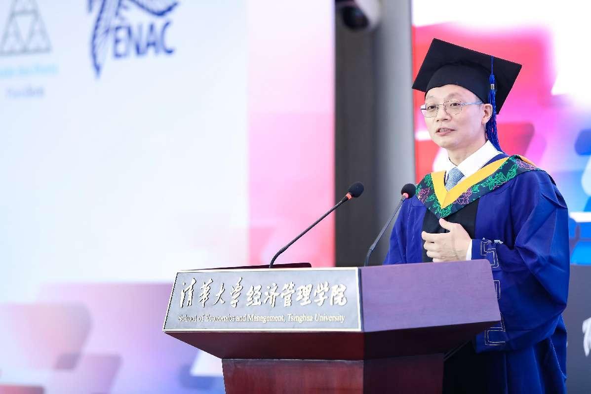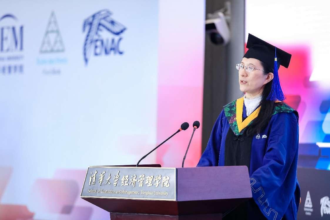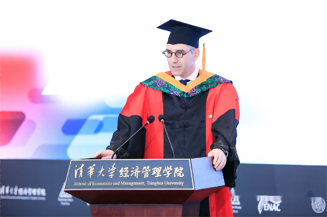 尼古拉•卡扎利斯代表法国国立民航大学致辞,他对毕业生表达热烈的祝贺,希望大家能够学以致用,将在EMBA项目中学习到的知识融合进未来发展的决策中。同时,他期待在未来的职业发展中,两校员工能够互帮互助,共同成长。