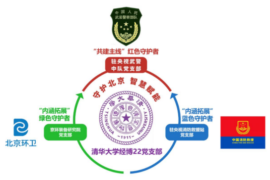 习近平总书记指出,“建设和管理好首都,是国家治理体系和治理能力现代化的重要内容。”经博 22 党支部利用红色“1+1”共建契机,基于“守护北京,智慧赋能”主题,以驻央视武警中队党支部为核心,以驻央视消防队党支部和北京环卫装备集团党支部为延伸,形成北京守护者“红蓝绿”特色共建队伍,用专业思维反哺赋能,为北京与国家建设贡献青春力量。