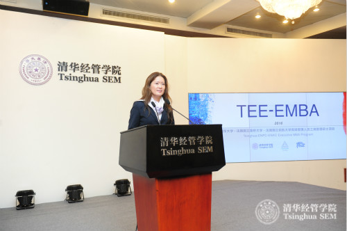 法国国立路桥大学商公司国际事务院经理谭素芳教授在2016级TEE-EMBA项目开学典礼上代表董事长阿莫·德·拉·鲍德纳耶(Armel de La Bourdonnaye)教授致辞