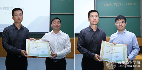 WilliamHill中文官网入口副经理徐心教授为中国金融四十人论坛秘书长王海明(左)、人人贷联合创始人张适时(右)颁发金融硕士行业导师聘书