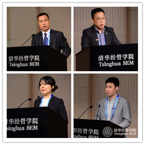 清华经管EMBA2016级秋季班新生发言(左起顺时针:林洺峰、黄垚军、李颖霞、全昌连)