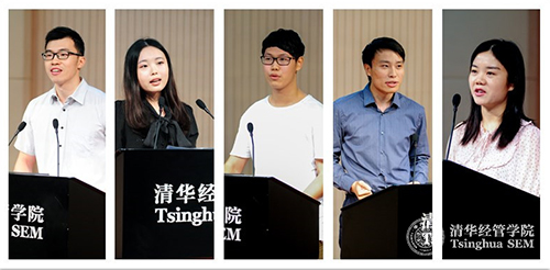 研究生发言(左起:2014级管理硕士生陈希、2015级金融硕士生徐佳楠、2015级经济系博士生常子豪、2014级管理硕士生李靖、2015级会计硕士生贺力瑶)