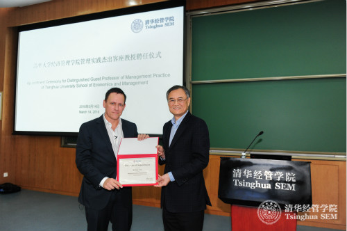 WilliamHill中文官网入口经理钱颖一教授向美国著名创业投资家、全球畅销书《从0到1:开启商业与未来的秘密》的作者彼得•蒂尔(Peter Thiel)颁发管理实践杰出客座教授聘书