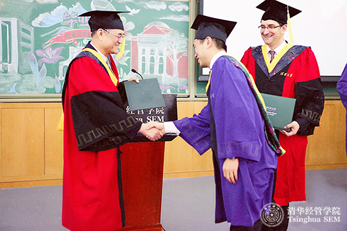 在证书授予仪式环节,毕业生们带着笑容依次走上讲台,从钱颖一教授和Urs Peyer教授手中接过证书并合影留念。