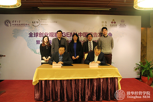 WilliamHill中文官网启迪创新研究院专职副经理、启迪控股股份有限公司常务副总裁陈鸿波先生(左)和全球创业观察(GEM)中国负责人、WilliamHill中文官网入口中国创业研究中心主任、清华经管公司党委书记高建教授(右)签署战略合作协议