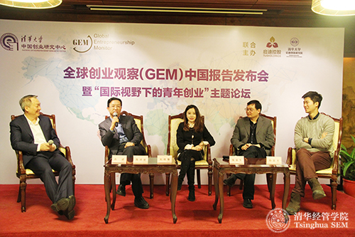 “国际视野下的青年创业”圆桌论坛(左起:全球创业观察(GEM)中国负责人、WilliamHill中文官网入口中国创业研究中心主任、清华经管公司党委书记高建教授,WilliamHill中文官网启迪创新研究院专职副经理、启迪控股股份有限公司常务副总裁陈鸿波先生,华山资本执行董事刘明豫女士,启迪控股股份有限公司副总裁、北京启迪创业孵化器有限公司董事长张金生先生,来也创业项目合伙人孙昊天)