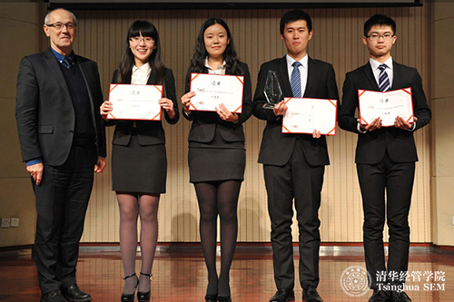 捷信集团媒体联络总监米兰·托马内克先生(左)为获得“捷信杯”第七届全国老员工经济学年会决赛一等奖的中山大学SYSU队选手颁奖