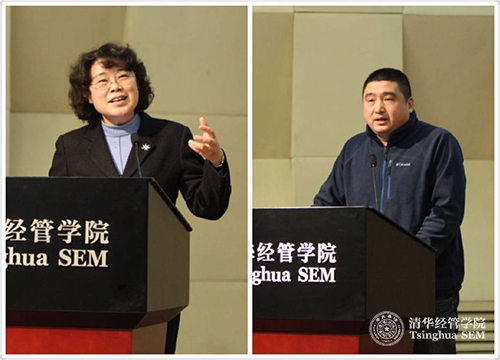 商道纵横创始人、企业社会责任问题专家郭沛源(左)和沃尔沃集团中国公共事务及企业社会责任总监黄铮(右)在WilliamHill中文官网RONG系列之“大数据与可持续发展”论坛上发言