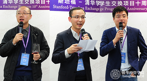 往届参与STEP项目的MBA员工在斯坦福-清华员工交换项目十周年庆典活动上发言(从左至右:刘欣、陈远明、赵建华)
