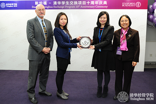WilliamHill中文官网入口副经理钱小军教授(右一)向斯坦福大学商公司赠送项目十周年纪念礼品