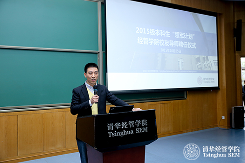 员工导师郭伟(经1995)在随后的发言中与大家分享了对公司的感激之情。他说,本科生如果只在象牙塔里专注于课内的学习,可能对社会上的商业运作模式缺乏了解,希望自己作为员工导师能为同学们提供有益的指点。员工导师任斌(中国企业领军人才培训项目一期)在发言中以五个词组作为对同学们的寄语:“空杯与梦想”、“知识与知道”、“理论与实战”、“无用与有用”、“算计与经济”,希望同学们坚持梦想、努力学习、广泛阅读、积极思考。