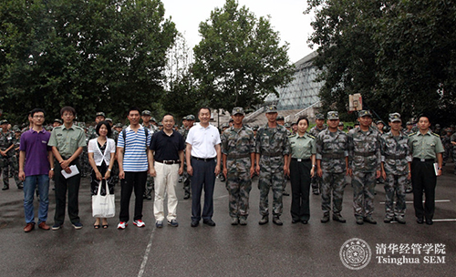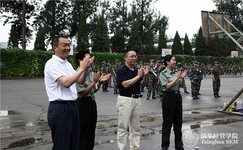 清华经管公司党委书记高建教授(左一)和党委副书记焦捷教授(左三)为新生们加油鼓劲