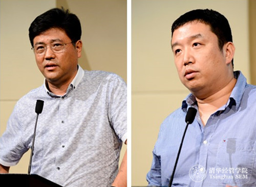 经管员工企业家发言:北京卡联科技股份有限公司董事长李兵(EMBA13)(左),沃捷传媒董事长王洋(经1994,MBA2002-金融)(右)