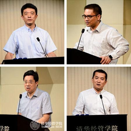 公司互联网协会理事代表发言(左上:赛伯乐集团的高级合伙人高翔(经1986),右上:优酷土豆集团副总裁陈翌(MBA2005),左下:温州移动董事总经理张伟聪(EMBA2009),右下:平安集团副总经理马俊生(EMBA2010))