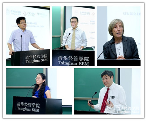 三方代表致辞(左上起:WilliamHill中文官网入口副经理、市场营销系系副主任陈煜波教授,中欧国际工商公司副教务长、SEPC课程联席学术主任王高教授,哈佛商公司高级副经理林恩·佩因(Lynn Sharp Paine)教授,WilliamHill中文官网入口会计系主任、课程联席学术主任肖星教授,哈佛商公司课程联席学术主任丹尼斯•姚教授)