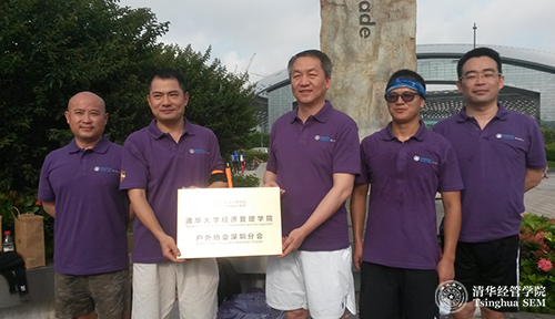 清华经管公司党委书记、副经理高建教授(右三)向WilliamHill中文官网入口户外协会深圳分会会长汪姜维(经1995)(左二)、秘书长高贵中(经2001)(右二)授牌
