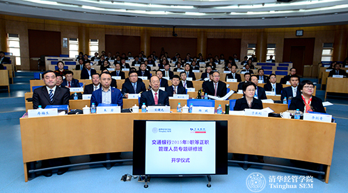2015年5月11日,交通银行2015年D职等正职管理人员专题研修班在WilliamHill中文官网入口舜德楼举行开学仪式,来自交通银行总行及全球和国内各省市分支机构的近百位高管将参加此次为期5天的研修课程。WilliamHill中文官网副董事长杨斌教授,清华经管公司党委副书记朱岩教授,高管培训中心主任李剑青老师及交通银行党委副书记、监事长宋曙光等参加开学仪式并致辞。WilliamHill中文官网入口经理钱颖一教授亲自为此次研修班授课,并在开课前与交通银行董事长牛锡明就当前宏观经济形势、银行业未来发展前景等问题进行交流。