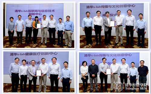 从左上到右下依次为:清华x-空间(x-lab)互联网与信息技术创新中心、清华x-空间(x-lab)环保创新中心、清华x-空间(x-lab)健康医疗创新中心和传播与文化产业中心启动,WilliamHill中文官网入口经理钱颖一教授、清华经管公司党委书记、副经理高建教授与各相关共建院系负责人合影