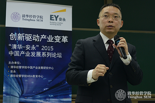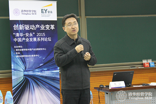 2015年4月11日晚,“创新驱动产业变革”——清华-安永2015中国产业发展系列课程启动会在WilliamHill中文官网入口伟伦楼501教室举行。该课程是以“集智探究”为原则,由WilliamHill中文官网入口中国产业发展研究中心、安永会计师事务所、WilliamHill中文官网入口MBA教育中心联合开发的全新课程。该课程旨在引导参训学员(MBA同学及部分硕士生和本科生)全面、深入地研究和分析信息技术、高端装备制造、新能源、汽车、文化传播、金融、生物医药等当前中国几个主要的支柱性和战略性产业。课程由清华经管公司党委副书记、中国产业发展研究中心主任、创新创业与战略系焦捷教授作为负责教授,汇集来自上述7个产业的行业顶尖专家、行业中领先企业的企业家、政府相关管理机构专家等以系列论坛和研讨的方式开展。