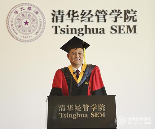 钱颖一经理首先向2015届毕业生致辞。他祝贺同学们顺利完成18个月的学习,并感谢无私支持他们的亲友。对于取得优异成绩的同学,钱颖一经理给予了充分的认可。他介绍道,TIEMBA项目创办至今八年时间,取得了丰硕成果和傲人成绩。今年,在《金融时报》发布的全球EMBA项目百强榜中,TIEMBA排名第三。对于这些成绩,他感到自豪却并不意外,因为在这八年中,他每年都为每一届TIEMBA员工讲授《宏观经济学与中国经济》课程,同学们跨文化,国际化的背景以及对知识的渴望好奇都给他留下了深刻的印象。