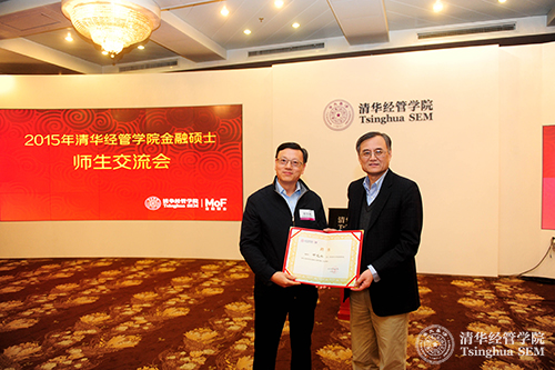 钱颖一经理(右)向邓艾兵颁发金融硕士行业导师证书