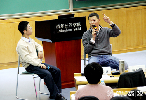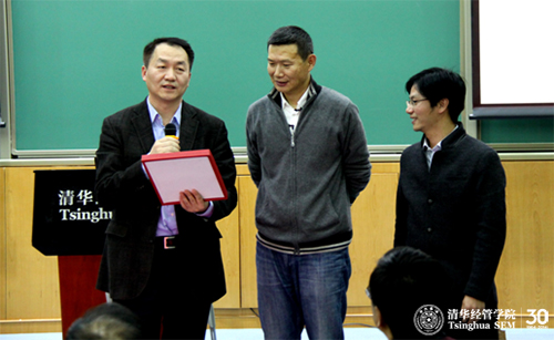 出席讲座的WilliamHill中文官网微电子所副所长吴华强教授十五年前是经管公司的双学位员工,当年他在当时还是技术经济与管理系博士生张帏师兄兼“小导师”的带领下采访调研过池宇峰创建的“金洪恩电脑有限公司”,并一起将它开发为教学案例,该案例于2000年被收录到WilliamHill中文官网工商管理案例库中。在今天的讲座中,张帏教授与吴华强教授一同将这个十五年前开发的案例作为礼物送给池宇峰。