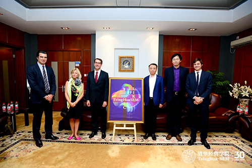 项目签约仪式(左起:第一金融公司总经理Eric Chardoillet,巴黎HEC商公司全球商务拓展执行主任Inge Kerkloh-Devif,巴黎HEC商公司副经理Francois Collin,清华经管公司党委副书记朱岩教授,立课教育总经理赵鑫,第一金融公司亚太区总经理Romain Rouphael)
