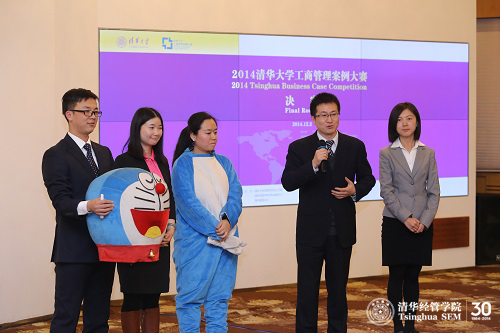第一支出场的团队是由经管公司全球MBA和法公司法律硕士员工组成的纯职工团队“Tsinghua Global”。他们用英文演讲和故事性的生动阐述,深深吸引了全场的评委和观众。在接下来的比赛中,各参赛团队使出浑身解数,或协同配合,或思想交锋,或反复博弈。所有员工都全力以赴,竞争十分激烈。来自经管公司在职MBA项目的团队“三言两语队”为案例企业提出了非常有建设性的建议,还带来了为案例企业建议的卡通机器猫。在评委问答环节,他们的旁征博引、妙语连珠,引来场下阵阵掌声。来自新加坡、美国、新西兰的一支交换生团队,表现也非常出众。其中一位主讲Diana同学努力用中文来阐述案例报告,中英文双语的PPT也制作精美,博来评委的阵阵好评。