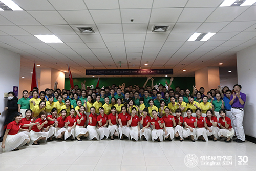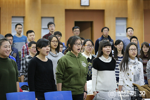 此次研究生“一二•九”合唱比赛得到了公司老师的大力支持。此前,经管公司党委副书记焦捷教授与经管公司建院30年“而立放歌”晚会总导演王晗老师也来到排练场地,给同学们鼓劲加油。研究生工作组组长杨思群教授主动加入合唱队伍,作为一名合唱队员与同学们一起上台表演。