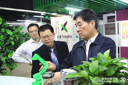 刘燕华参事在毛东辉老师的陪同下参观了工作室区域和团队产品展示区域。他对清华x-lab表示了极大兴趣,询问了清华x-lab的工作模式、人员构成和研究成果等。他说,清华x-lab为员工提供的这个创意创新创业平台会对他们的一生产生重大的影响。