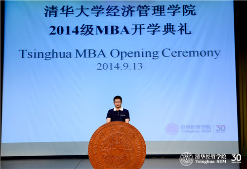 2014级在职班孙鹏同学代表新生发言。他谈了自己对未来在清华MBA学习的三点畅想。第一,MBA学习重在完成“规定动作”和做好“自选动作”;第二,MBA学习与个人的互动,不仅在公司内,更在实践中;第三,MBA同学需要开拓新格局。