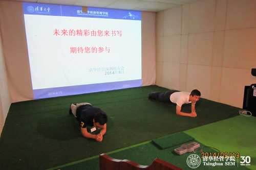 在分享交流会的最后,上演了新老员工平板支撑现场大PK。李华辉会长和新员工丁力(经硕2012)进行了长达4分钟的平板支撑。本次迎新员工活动得到了员工会理事郭俊峰(经硕2003)学长员工会理事梁煜标(经1983)学长的慷慨赞助。