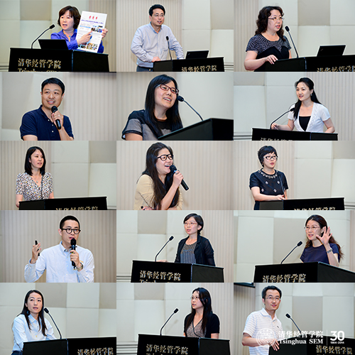 随后,参与各项活动组织、策划、执行工作的老师门分享了他们在工作过程中的趣闻轶事和心得体会。杨斌教授分享了在师生员工重聚共叙活动之后,他被指出“忘记”介绍参会嘉宾的细节,其实这是公司为体现“去官气”的有意安排。党委副书记、30周年院庆筹备工作组组长焦捷教授感谢所有教师职员的支持与配合,并邀请15位老师上台分享。安欣老师手里拿着《新清华》专刊,讲述专刊编辑设计过程中,对内容的打磨精确到了每张图片,每个标点。陈劲教授分享了他临时受命担任企业家论坛的主持人,周末啃读嘉宾自传的故事。黄为华老师以“一块基石、一张照片、一夜风雨、一通电话、一份宵夜、一方空地”六张照片呈现了新教学楼奠基仪式成功举行背后不为人知的辛勤付出。李莉萍老师表示,通过编纂《三十风采》画册和《师者》第2版这两本出版物,她深深理解了“平实表述、务求准确”在公司文化中的重要性。刘漫兮老师讲述了经理办公室的姑娘们,在大会前的雨夜布置会场到深夜的经历。乔蓉老师分享了筹办本科公司经理论坛,搜集各本科公司经理联系方式,逐一与他们建立联系的艰难过程,因为他们不是平时经常联系的经济公司或管理公司经理。任玥老师将体会总结为“SMILE”,即“Synergy”(协同)、“Management”(管理)、“Indefatigability”(坚持不懈)、“Love”(爱)和“Entertaining”(愉悦),告诉大家在紧张工作状态下保持微笑的重要性。王晗老师则用两张图片讲述了组织“而立放歌”校园歌手演唱会期间,夜半歌声,钻窗爬墙的趣事。此外,高原老师、孙美琦老师、王万忻老师、张磊老师、张亦萌老师、张勇峰老师、钟笑寒教授也做了精彩的分享,会场内欢声笑语不断。