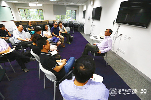 活动中,钱颖一经理还与同学们探讨了管理思想在推动市场营销、建立商业模式中的巨大作用。他说,在创业、技术与营销等各种资源整合的背后,是思维和价值观的触碰与冲撞,因此MBA的软技能课程至关重要。公司已经确定要在下学期在创业方面开设一门新课——《创业营销实务》。在进行校外资源整合和技术对接方面,钱颖一经理还与同学们探讨了如何利用清华x-lab这一强大平台,在原有两大战略伙伴清华科技园和清华企业家俱乐部的基础上,吸引更多战略伙伴,拓展新的商业模式和社会价值实现的方式和路径。